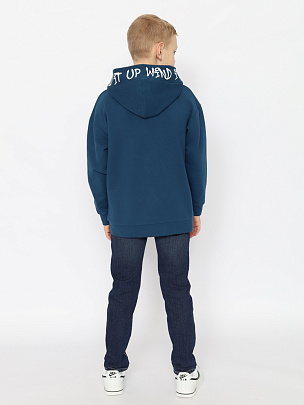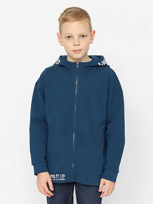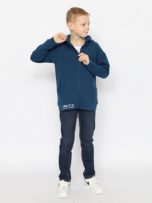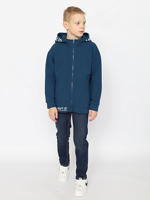 Толстовка с центральной застежкой, длинными рукавами, притачным поясом и манжетами. Манжеты выполнены из полотна с добавлением лайкры, пояс выполнен из основного полотна. Капюшон с отрезной планкой и подкладкой. На передней части расположены рельефы с карманами. Пояс декорирован принтом. Планка капюшона декорирована принтом "Стремись вперед", "Не останавливайся иди вперед".