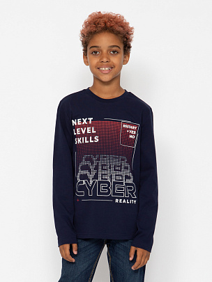 Водолазка для мальчика с воротником-стойкой, с отворотом. Рукава длинные с манжетами из основного полотна по низу. Перед водолазки декорирован принтом "Проследи свой путь".