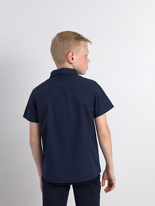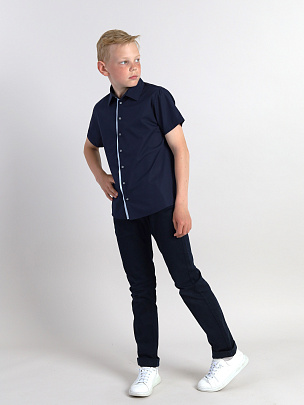 Рубашка классическая, полуприталенного силуэта, с коротким рукавом из хлопка. Воротник обтачной с притачной стойкой. Планка оформлена декоративным кантом контрастного цвета.